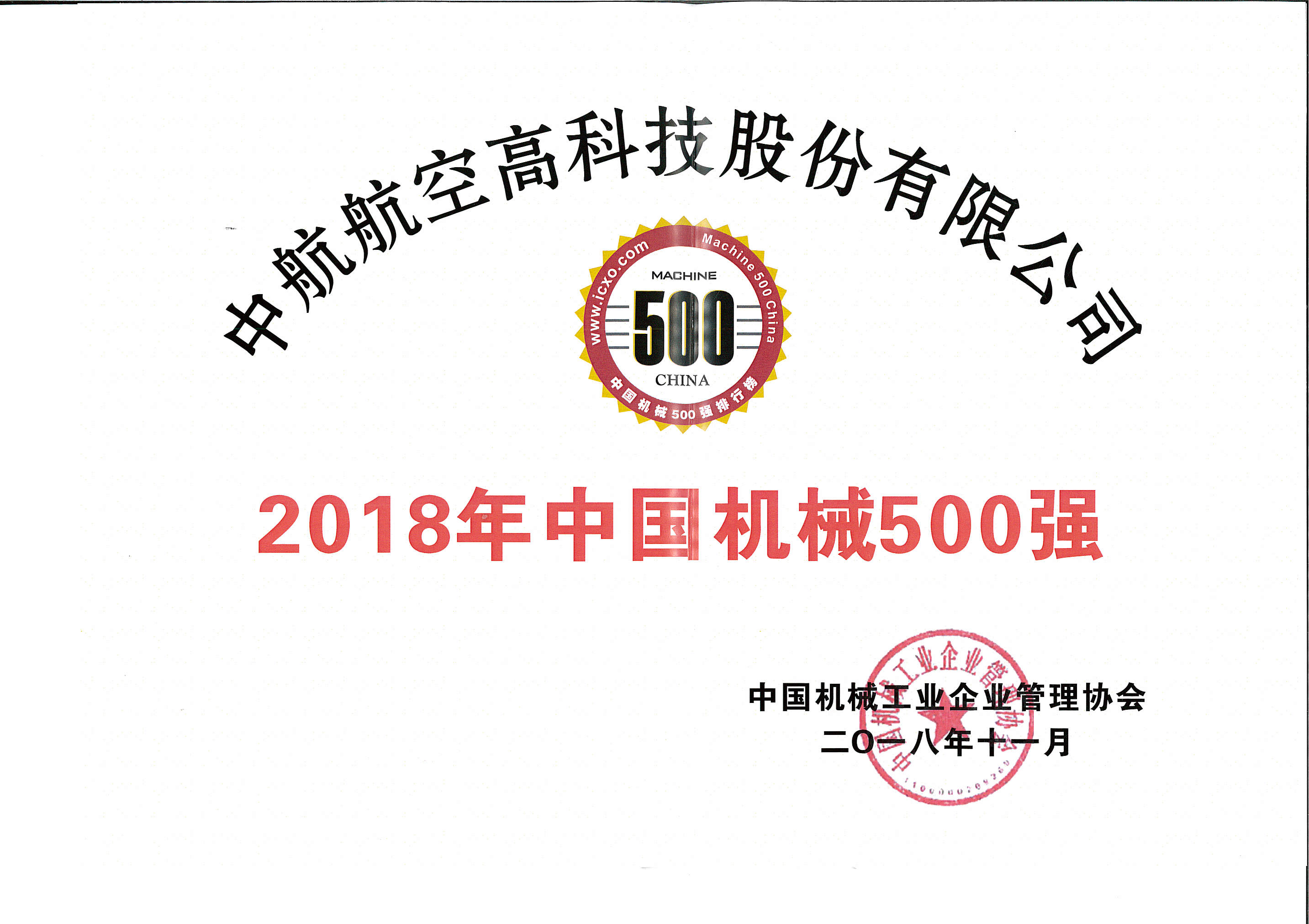 近日,在2018年(第十六屆)《中國機(jī)械500強(qiáng)研究報告》調(diào)查發(fā)布活動中,中航高科榮獲中國機(jī)械工業(yè)企業(yè)管理協(xié)會頒發(fā)的“中國機(jī)械500強(qiáng)”榮譽稱號。