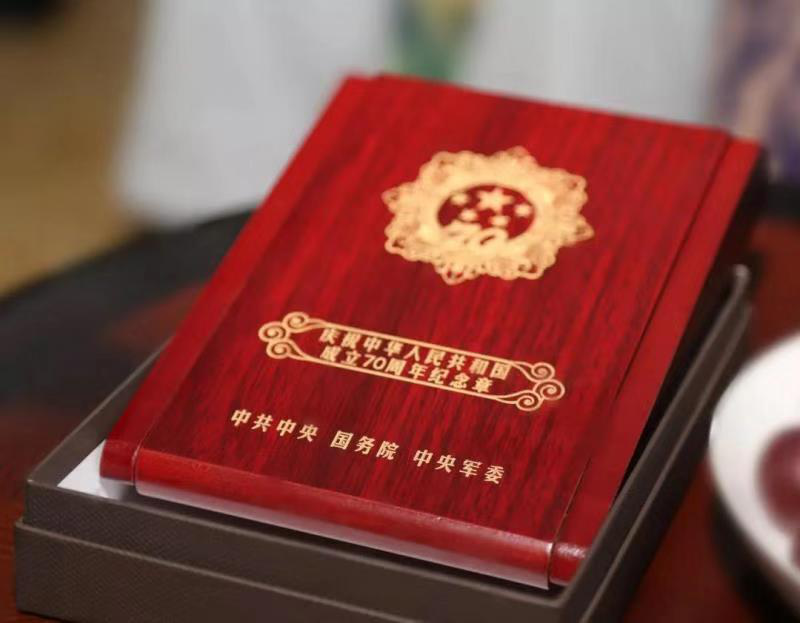 本次走訪慰問活動恰逢祖國70周年喜慶,中共中央、國務(wù)院、中央軍委為老干部們制作了“慶祝中華人民共和國成立70周年”特制紀(jì)念章。紀(jì)念章使用銅胎鍍金材質(zhì),通徑為50毫米,主要元素為五星、“70”飄帶、團(tuán)錦結(jié)、如意祥云和光芒,主色調(diào)為紅色和金色?!?0”飄帶象征中華人民共和國70年奮斗歷程。章體外環(huán)以如意祥云、光芒構(gòu)成,象征人民對美好生活的向往,同時表達(dá)隆重慶祝中華人民共和國生日,禮贊國家富強(qiáng)、民族振興、人民幸福的輝煌成就,以及在70年輝煌奮斗成就的基礎(chǔ)上不忘初心、繼續(xù)前進(jìn)的堅定決心。每枚紀(jì)念章內(nèi)側(cè)均打印編號,每一個編號對應(yīng)每一位離休老干部的名字。