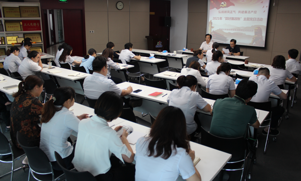 近日,眾和擔保黨支部組織開展“算好廉政賬”主題黨日活動,全體黨員、入黨積極分子、公司領導班子成員、中層以上干部及子公司領導班子成員參加,活動由黨支部書記何葉主持。