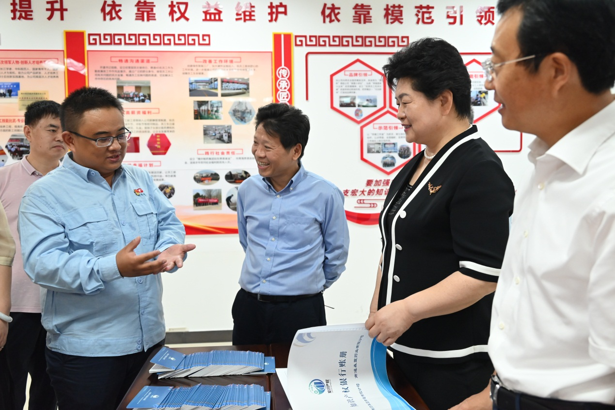 公司董事長、總經(jīng)理袁擁軍代表公司全體員工對蔡毅德一行表示熱烈的歡迎,并陪同參觀了公司黨群活動室、產(chǎn)改工作室,詳細介紹了在公司“五彩黨建”引領下,以“五個依靠、五心工程”為抓手開展的一系列產(chǎn)改工作。袁擁軍匯報了公司近年來在黨建工作、生產(chǎn)經(jīng)營、科技創(chuàng)新、人才培養(yǎng)、產(chǎn)業(yè)工人改革等方面取得的優(yōu)異成績。調(diào)研過程中,來訪人員饒有興趣的了解了公司 “員工幸福計劃”、“知識產(chǎn)權銀行”制度、“青藍工程”等亮點工作和做法,并給予高度肯定。袁擁軍向來訪人員贈送了由公司黨員和管理骨干開展讀書征文活動編撰的 “單位如家、感恩有我”、“奮斗如歌”、“責任如磐、攻堅有我”系列叢書。
