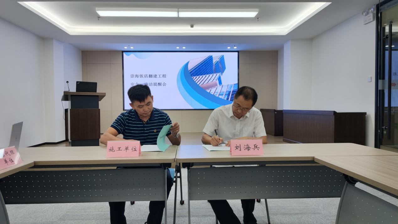 會上,國融公司黨委書記、董事長、總經(jīng)理劉海兵向與會人員介紹崇海飯店翻建項(xiàng)目具體情況。國融公司與相關(guān)合作方簽訂安全責(zé)任書、廉潔責(zé)任書,項(xiàng)目管理人員簽訂廉潔承諾書。