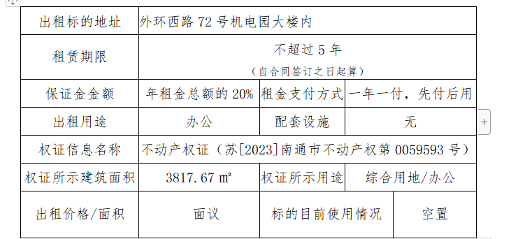 南通國(guó)泰創(chuàng)業(yè)投資有限公司所托管園區(qū)外環(huán)西路72號(hào)機(jī)電園,已由南通三玖企業(yè)管理服務(wù)有限公司中標(biāo)負(fù)責(zé)整體招商運(yùn)營(yíng)管理,擬打造成“產(chǎn)業(yè)研發(fā)、辦公及配套商業(yè)”的總體格局,即日起公開對(duì)外招租。 一、出租標(biāo)的信息