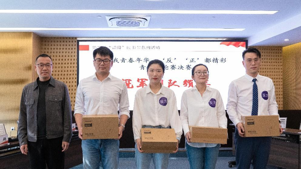 頒獎(jiǎng)環(huán)節(jié)公布了好書薦閱活動(dòng)中投票前十名的選手,他們將獲得集團(tuán)黨委書記《帶著工匠精神去工作》贈(zèng)書一本。吳玉祥為“好書漂流、愛心無限——跳蚤書市”活動(dòng)中,個(gè)體捐書121本的來自制劑生產(chǎn)公司的陳帝舒頒發(fā)了精華捐書達(dá)人獎(jiǎng)。周云中為正方越琢磨越隊(duì)頒發(fā)了亞軍團(tuán)隊(duì)獎(jiǎng)。尹紅宇為反方傳承精華隊(duì)頒發(fā)了冠軍團(tuán)隊(duì)獎(jiǎng)以及為正方二辯郭佳燕頒發(fā)了最佳辯手獎(jiǎng)。