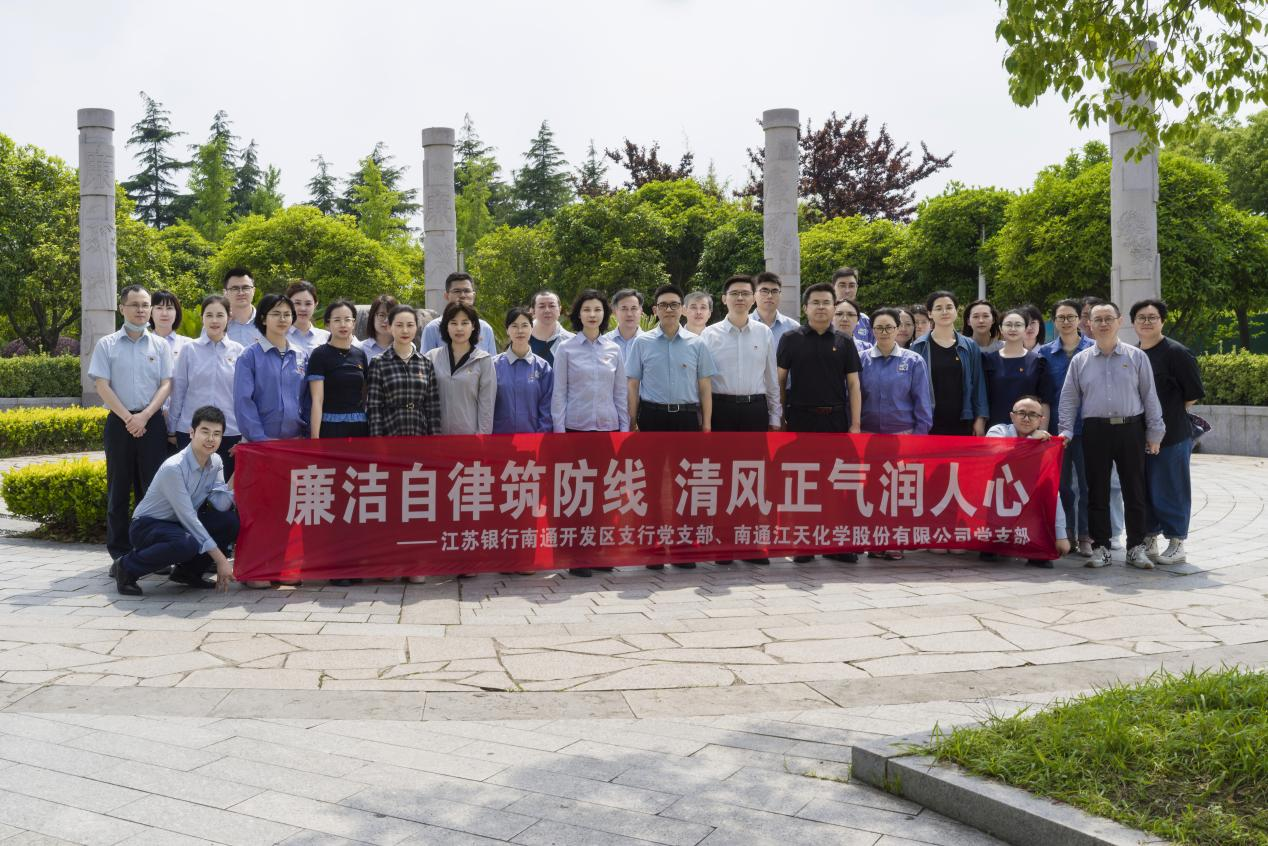 5月22日下午,江天化學(xué)黨支部與江蘇銀行南通開發(fā)區(qū)支行黨支部攜手共赴南通廉潔文化廣場,開展“廉潔自律筑防線 清風(fēng)正氣潤人心”主題黨日共建活動。江天化學(xué)支部書記、副總經(jīng)理張永鋒,支部副書記、副總經(jīng)理沙曉東,支部委員、副總經(jīng)理史彬,江蘇銀行南通開發(fā)區(qū)支行黨支部書記、行長孫晴等出席活動。